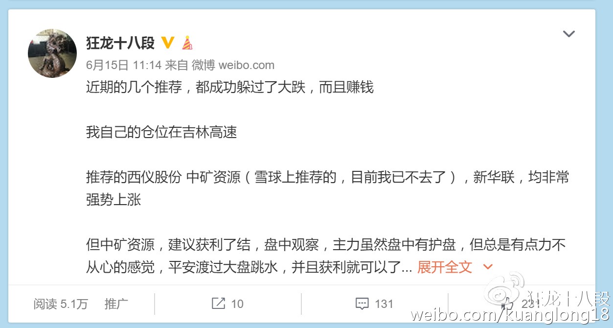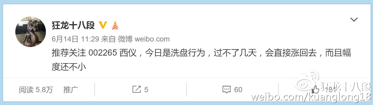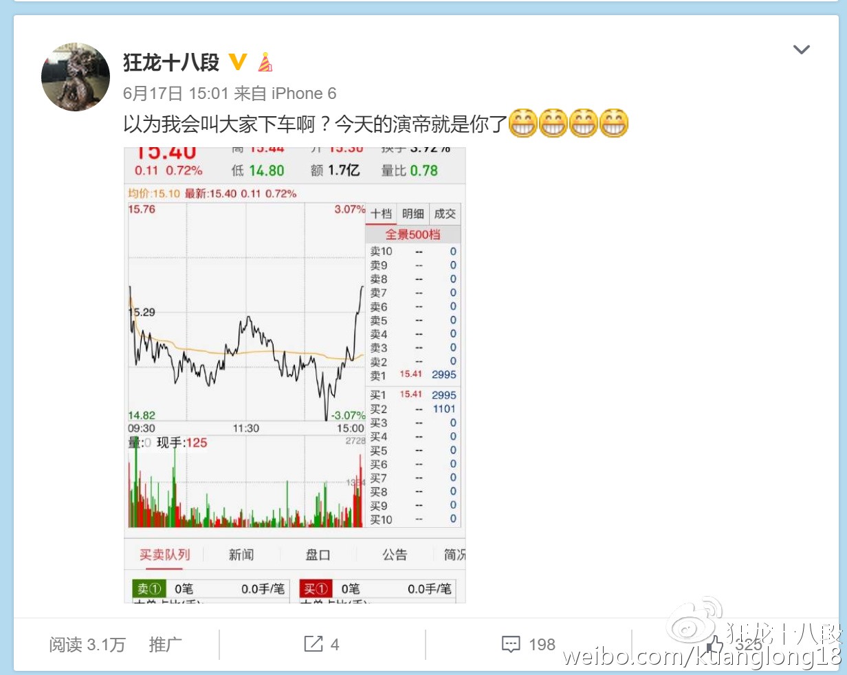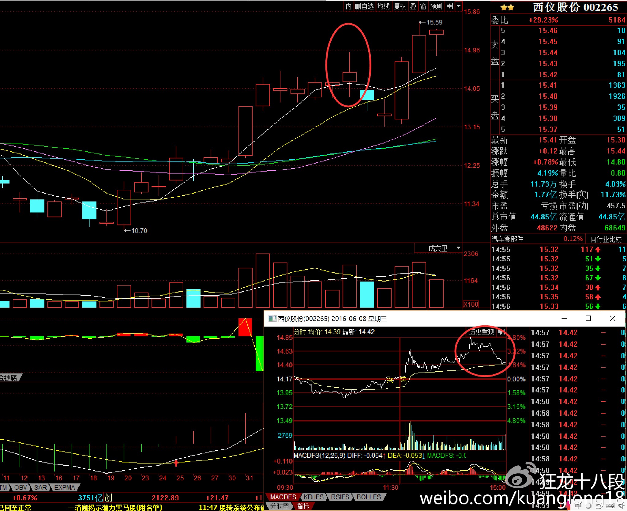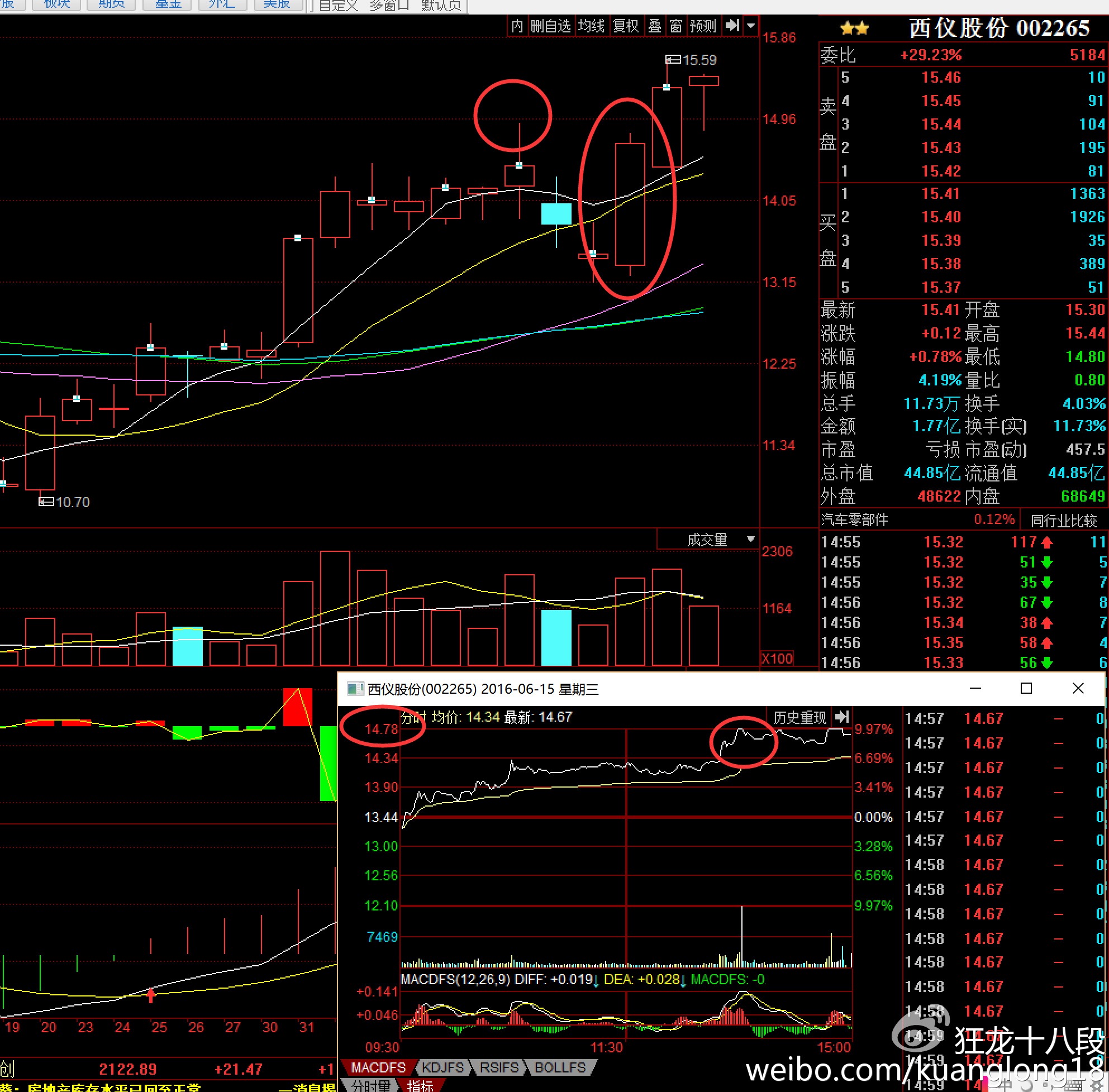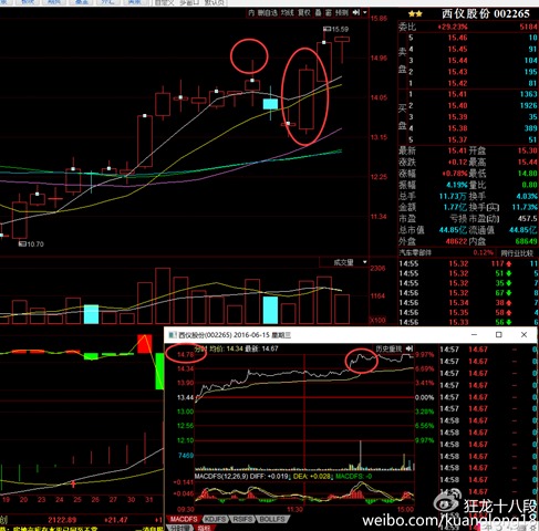 6月15日,强势上涨,最高摸至14.78(涨停位),而四天前,洗盘(6月8号)开启那天,最高摸至14.85元,如果主力想在这个区域出货,那在8号那天,何不尾盘直接再往上拉到15元以上,次日就可以开始出货了,犯的着,连洗三天盘,再来拉一个涨停,拉一个涨停才14.78元,这显然不是庄家的目标位,因此,还早,我一直坚持叫大家拿着,这个就是基本逻辑