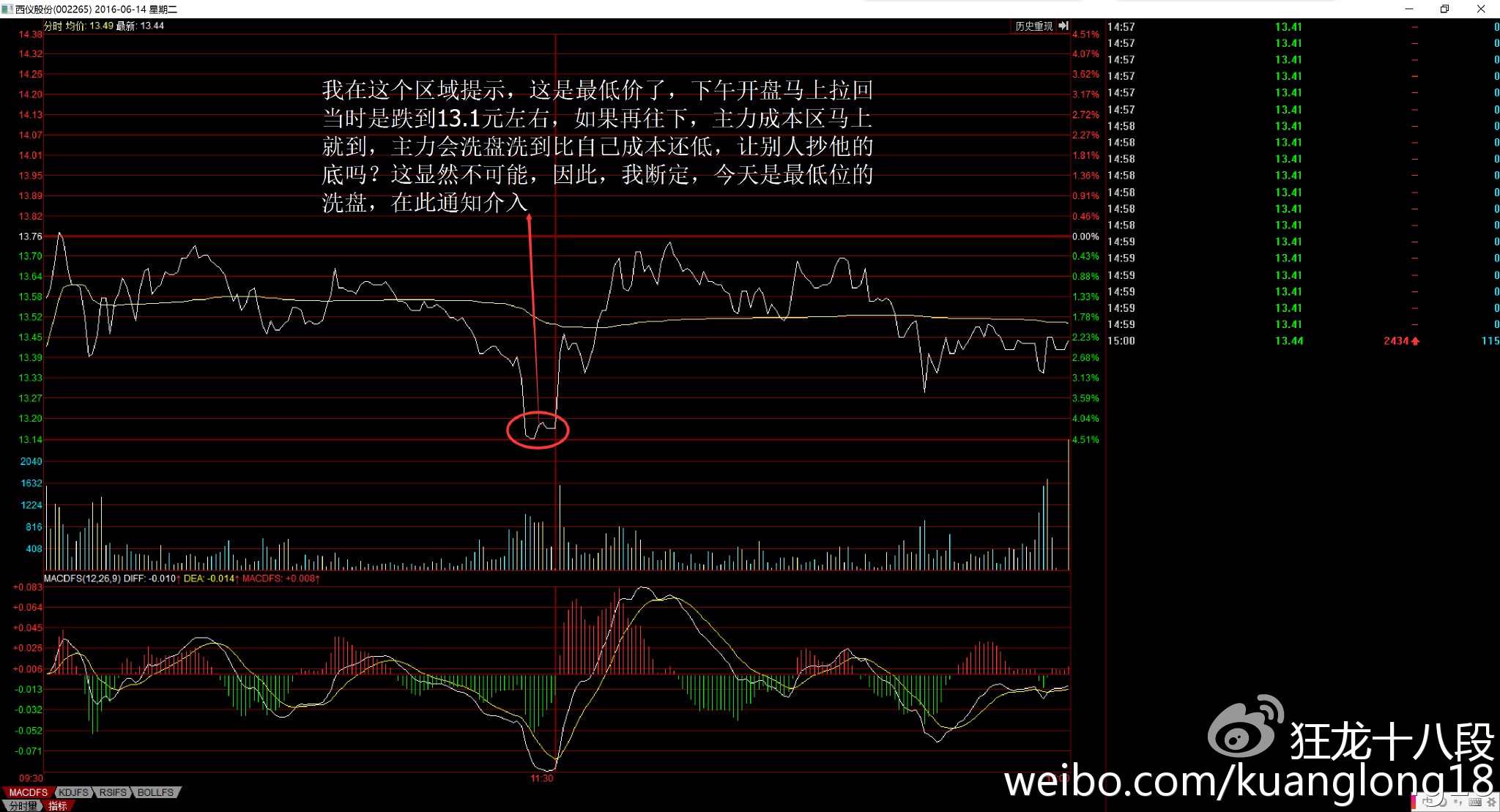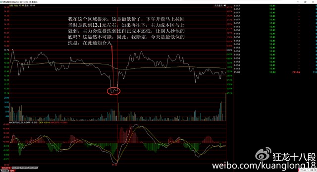 洗盘第一天,最高冲至14.89元,涨幅为4.8%,尾盘直接往下打,收至微涨1.7%,随后连续三天都是持续小幅度下跌,缩量洗盘的过程,随后我在最低位叫买入,当天微赚2%,次日大涨,最高拉至涨停,我在盘中发的贴子是: