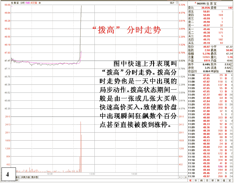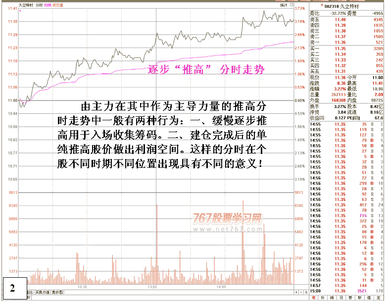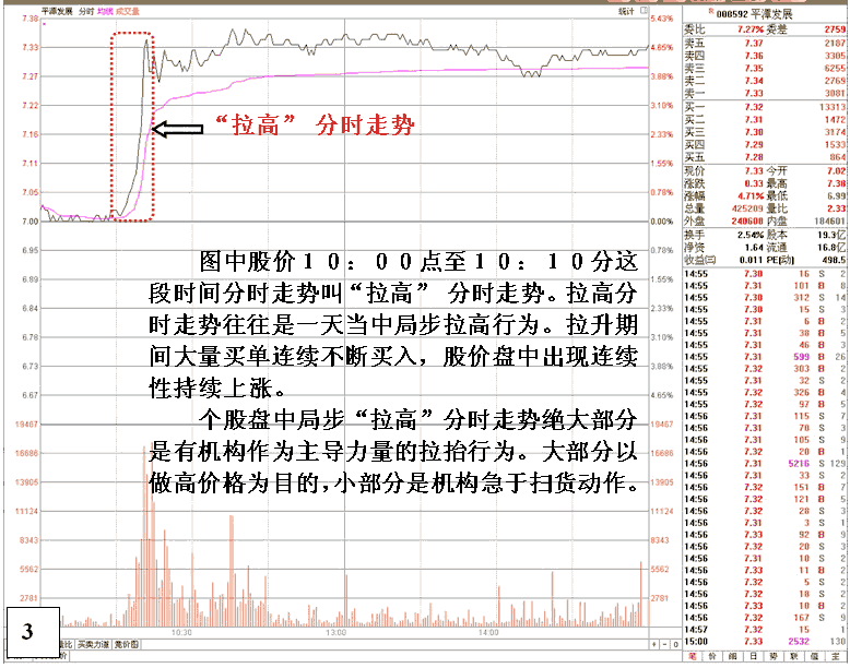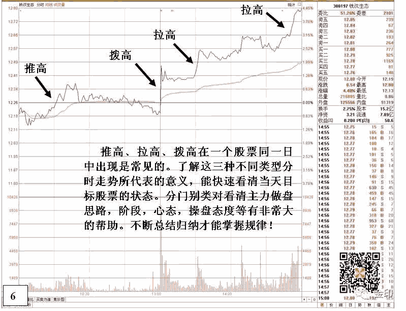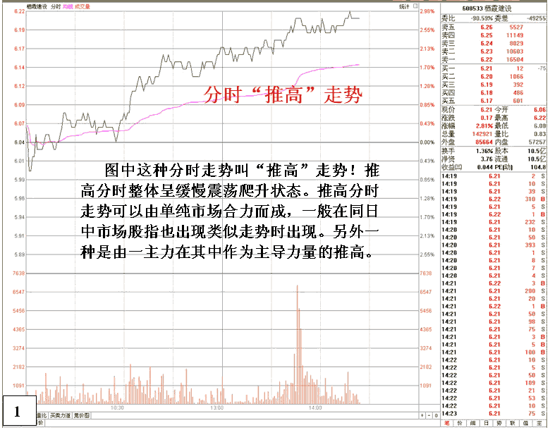 个股盘中股价上升不同的表现在分时走势上有N种表现。每一种表现有不同的特点和意义。常见的分时走势中按表现比较经典的这有三种“推高﹑拉高﹑拨高”。这三种分时走势下股价同样是上升,但却有不同的市场意义。下面就这三种分时走势分析市场和主力信息。